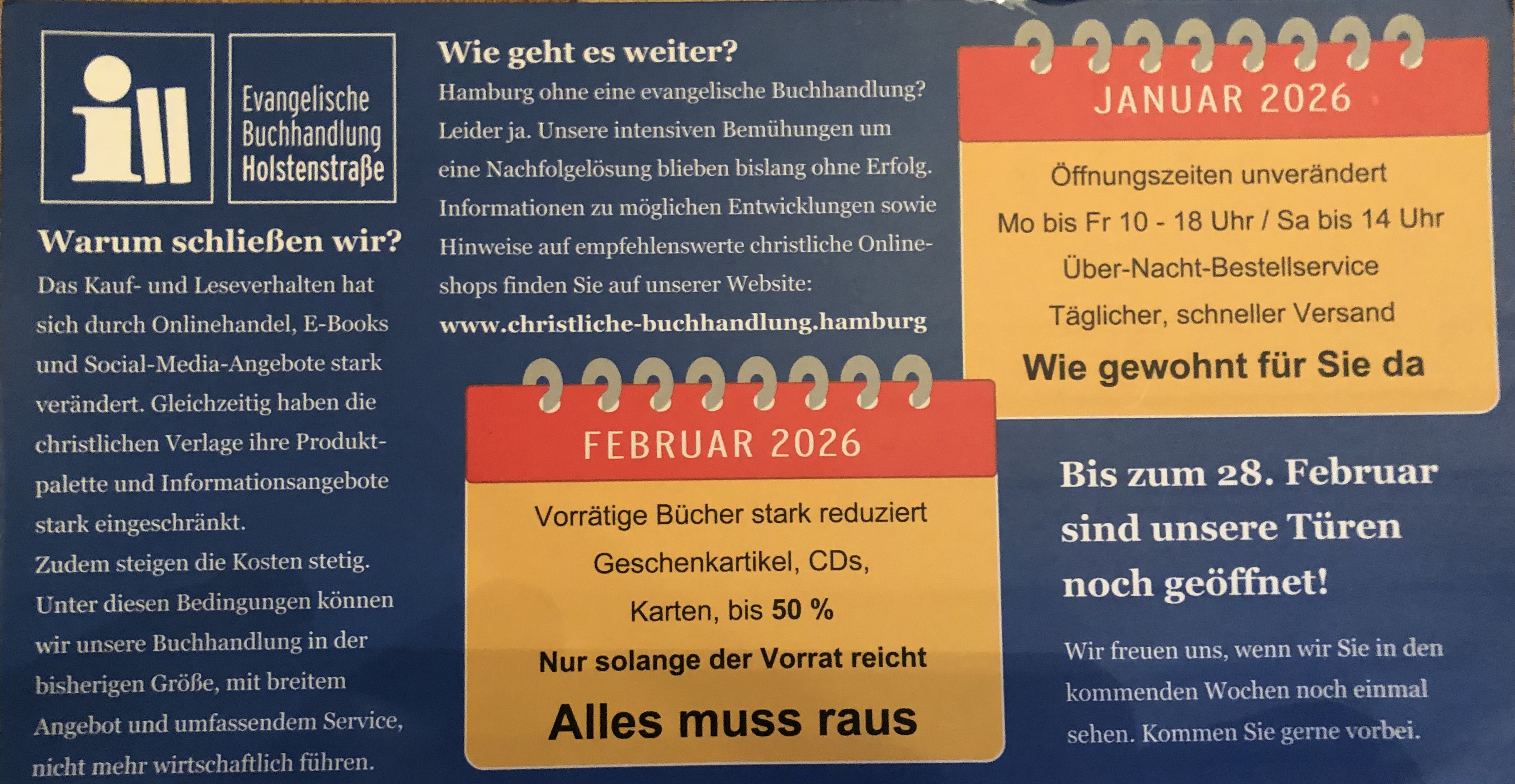Die Evangelische Buchhandlung Holstenstraße in Hamburg Altona schließt.