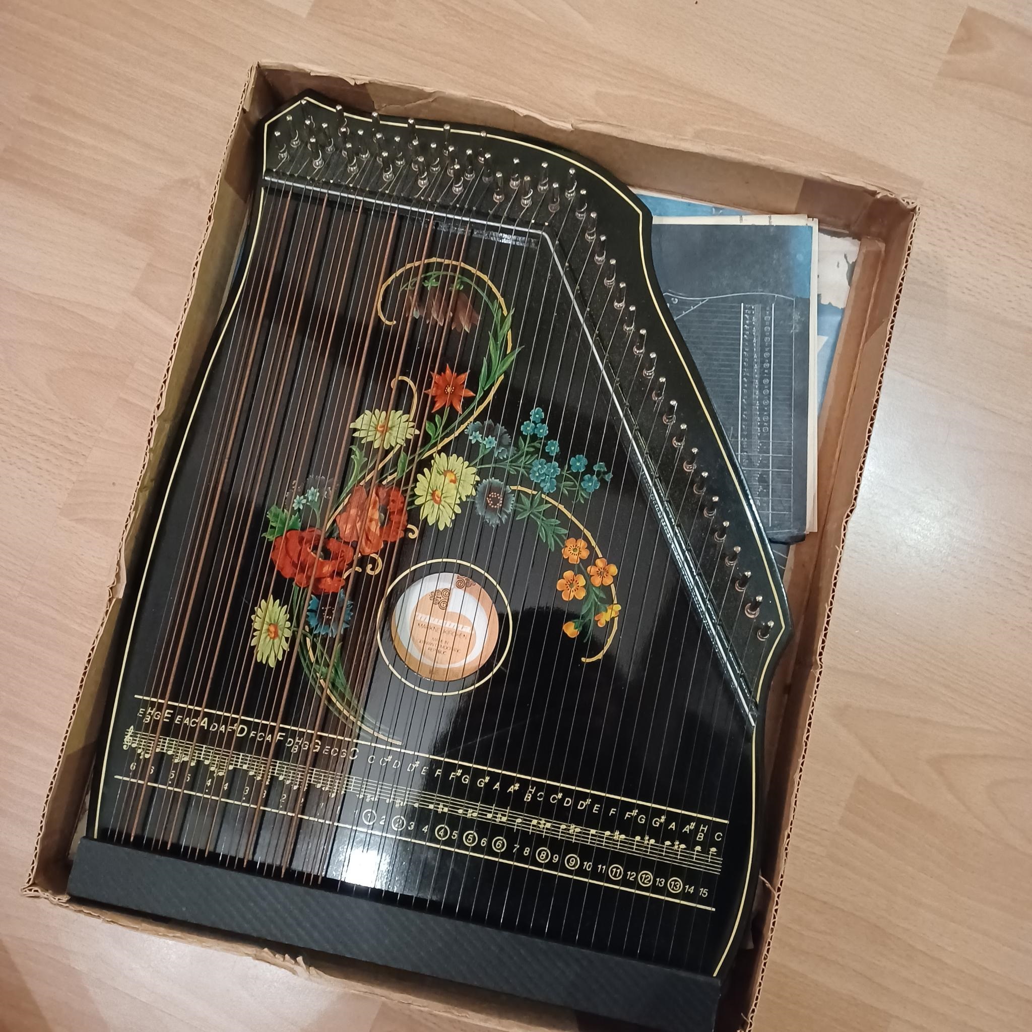Eine Akkord-Zither aus Markneukirchen, geziert mit Blumen-Ornament, und in der DDR gebaut, lädt mich ein, neue Saiten aufzuziehen, zu stimmen, und Neues zu lernen. Jubel-Töne steht in der Mitte der Zither und auf der beiliegenden Karte Dank für die Musik, die ich geschenkt habe. Vorne zeigt die Karte eine gedeckte Kaffeetafel im sommerlichen Garten und leise schleicht sich das Zitat ins Bild „Man kann auch mit den Ohren schenken“.