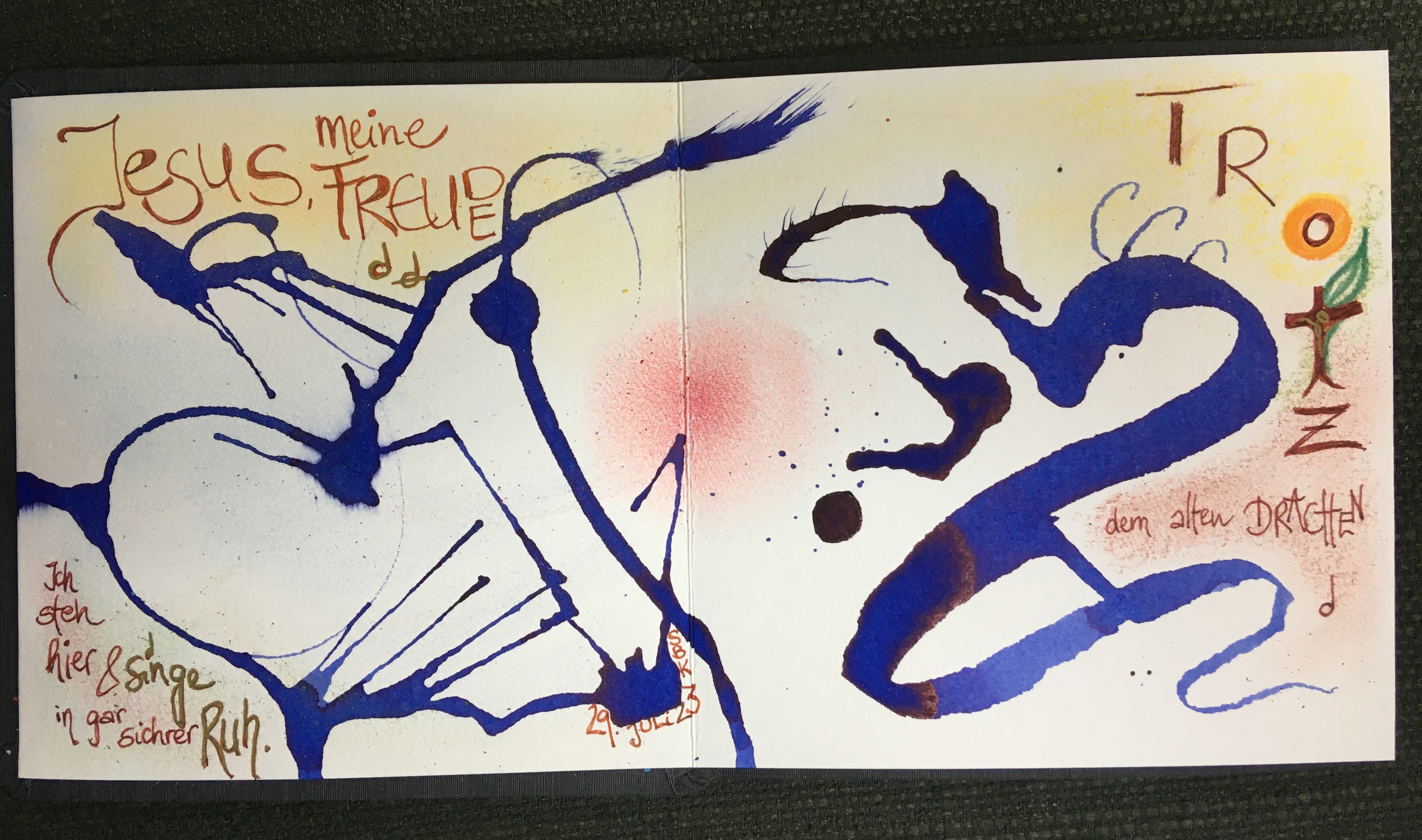 Das ist die dritte Strophe des alten Chorals Jesu, meine Freude, den ich seit gefühlten Ewigkeiten nicht mehr gesungen hatte. Heute passten Text und Melodie und Stimmung. Moll, und doch sich zu Höhen aufschwingend, im starken Kontrast zum "Brummen", das mich dieser Tage und Stunden - am 92. Geburtstag meiner vor 30 Jahren verstorbenen Mutter und am Vorabend des 7. Todestages von Carol begleitet. Tinte und Töne nennt Claudia, was mir da widerfährt.