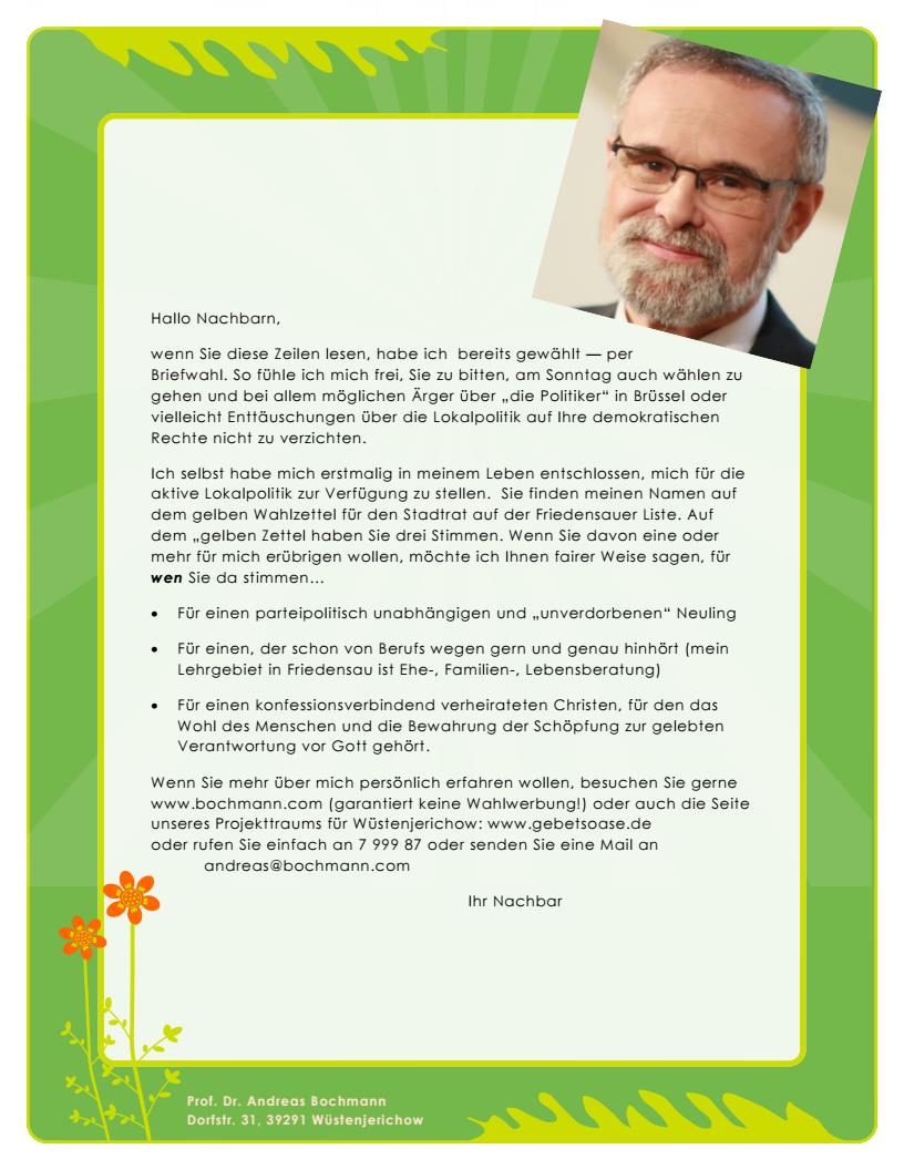 Da nun auch Bürgerinnen und Bürger in Wüstenjerichow für mich stimmen können (komische Vorstellung), dachte ich, sie sollten es auch wissen. Also habe ich flugs einen Brief an die Nachbarn in Wüstenjerichow geschrieben und von Hand verteilt. Das gab auch gleich die Chance, auf diese Website, sowie die Website der Gebetsoase hinzuweisen.