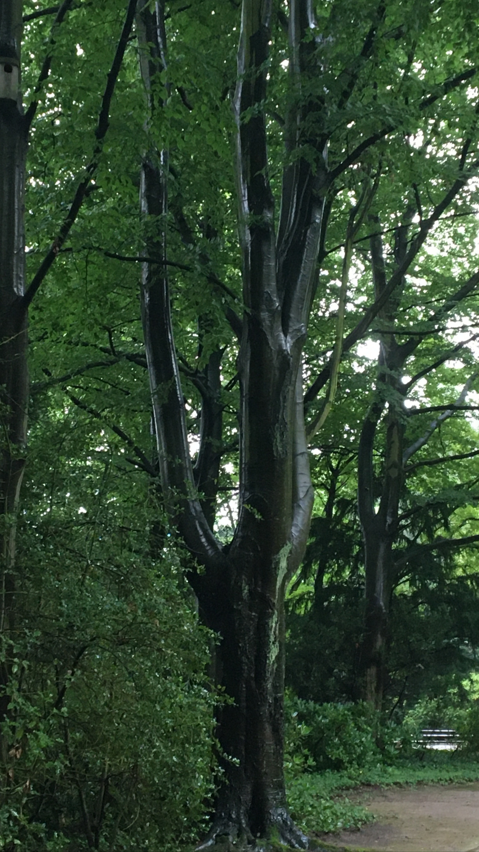 Es ist ein Regentag. Nie hat mich der Glanz der Buchenbaumstämme auf dem Friedhof so berührt wie heute. Eine neue Sicht, ein eigener Moment, am Ort meiner Kindheit. Auch das Grün im Ruhrgebiet, entlang der Autobahnen, tat mir einfach gut. Ich liebe diese Vielfalt der Grüntöne, die Geborgenheit, die davon ausgeht. Die Stadt allein zieht mich nicht mehr an, es sind doch immer wieder die Menschen, die Orte der Erinnerung, meine eigene Geschichte.