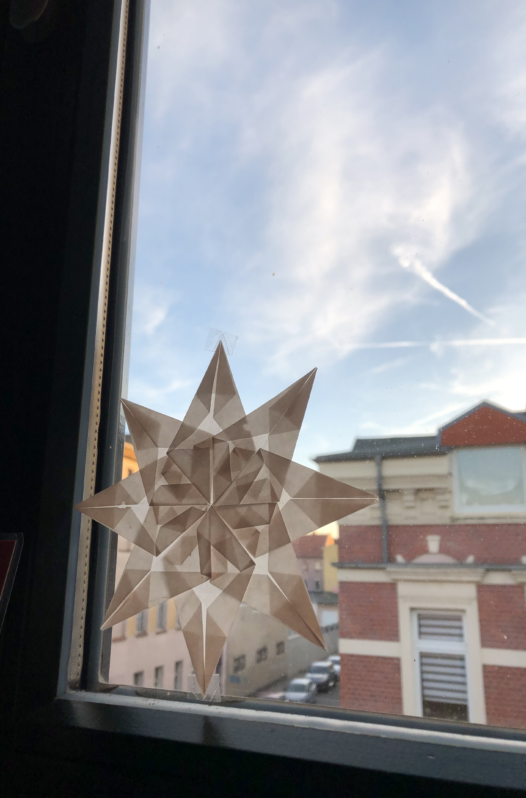 Auch wenn ich nie zu den großen Bastlerinnen gehörte – irgendwie mag ich das nicht nach Vorlage etwas genau umsetzen zu müssen – erinnere ich mich, wie ich als Kind Stunden damit verbracht habe, mit Bleistift, Lineal und Schere, verschiedene Größen an transparentem Papier anzufertigen, um sie dann zu falten und Stern zu formen – einfarbig, vielfarbig, kleine und große. Von denen habe ich keinen mehr. Keine Ahnung, ob sie gleich nach Weihnachten in den Müll kamen, als sie von den Fenstern genommen wurden. So ganz nach dem Motto: kann man doch nächstes Jahr neu basteln. Ja, kann man – habe ich aber nicht. Die Phase war vorbei. Und sie kam auch bisher nicht wieder. Ich bin eben keine Bastlerin, auch wenn ich sehr kreativ unterwegs bin.