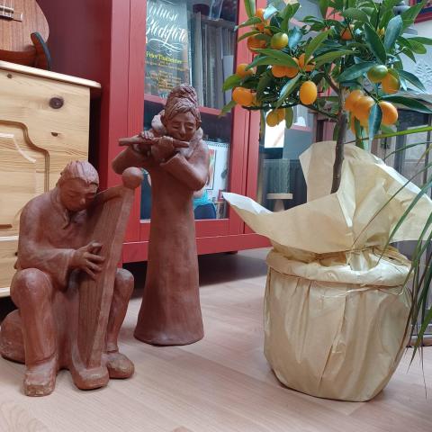 Der Reigen der Generationen, der Vielfalt der Gemeinde, war ein bunter Blumenstrauß. Auch unsere Wohnung ist heute gefüllt mit weißen Rosen, bunten Sträußen, Pflanzen und Bäumchen. Musik erfüllt den Raum. Neben zwei Tonfiguren, die ihr Lied anstimmen, zeigen Fotos den musikalischen Einsatz von Andreas und mir.