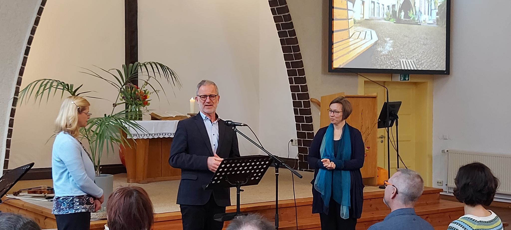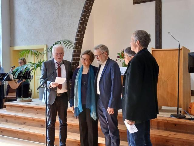 Hans-Martin Richter überbringt Grüße des ökumenischen Arbeitskreises der Stadt Brandenburg und vergleicht Claudia mit einem Esel...Als Andreas und ich uns vor mehr als sieben Jahren verlobten und dann heirateten, lebten wir bewusst mit dem Zuspruch aus Jesaja 35,6: „Es werden Wasser in der Wüste hervorbrechen und Ströme im dürren Land“. Damals planten wir unser gemeinsames Leben in Wüstenjerichow, trugen das Anliegen der Gebetsoase auf dem Herzen, und sahen uns gemeinsam in den Dienst gestellt unsere Berufung zu Leben: Menschen zu begleiten und das Evangelium zu verkündigen. Das wir uns ein Jahr nach der Hochzeit auf den Weg machten unser Haus zu verkaufen, gemeinsam in Schönebeck wohnen würden, um jetzt nach Genthin zu ziehen, ahnten wir damals noch nicht. Ehrlich: vor gut einem Jahr ahnte ich noch nicht, dass wir nach Genthin ziehen würden und das gleich mit Familie, und ich als Oma ins eigene Haus.